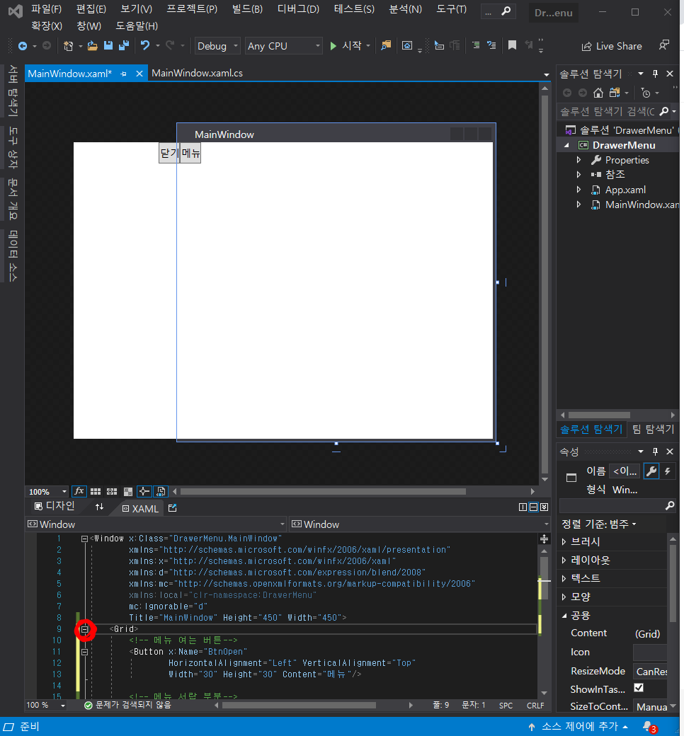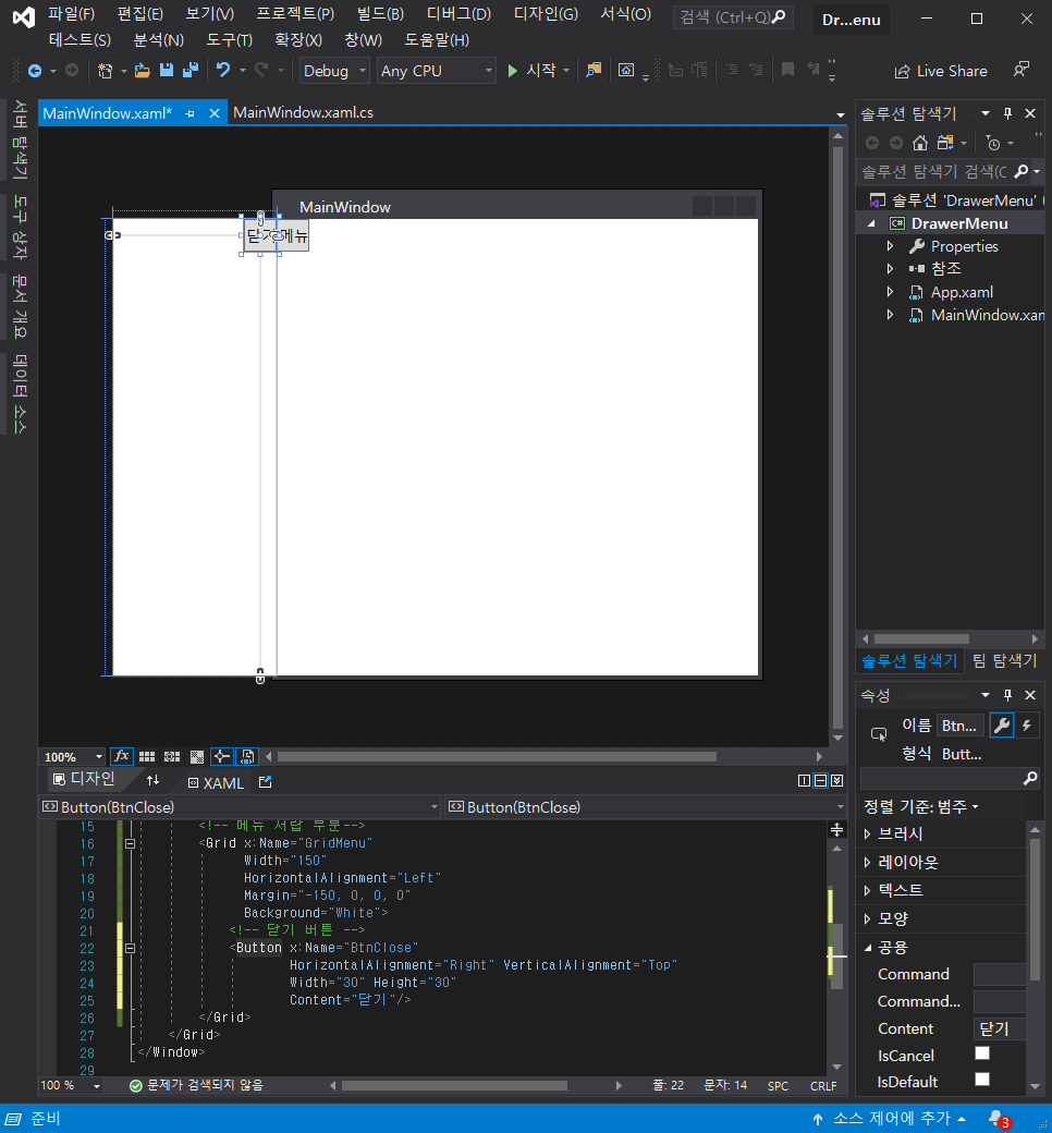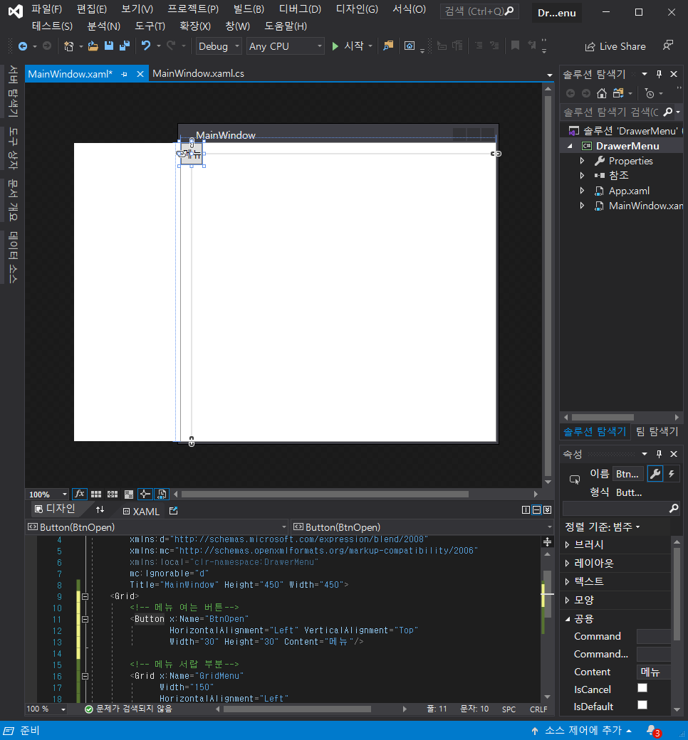 2번에서 만들었던 메뉴 서랍 Grid 위에 Button을 생성합니다.
