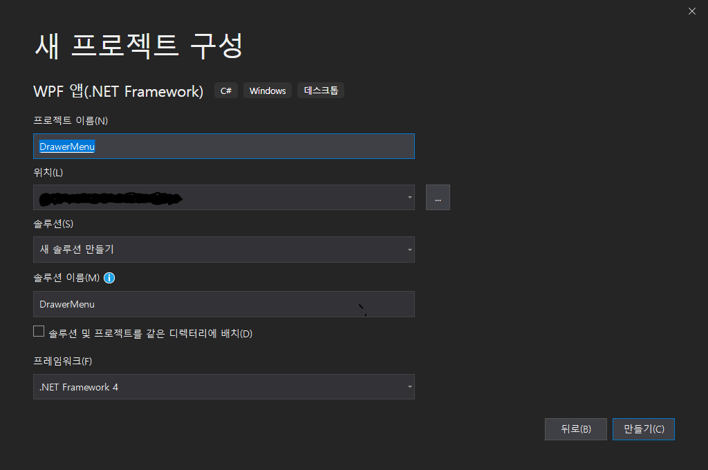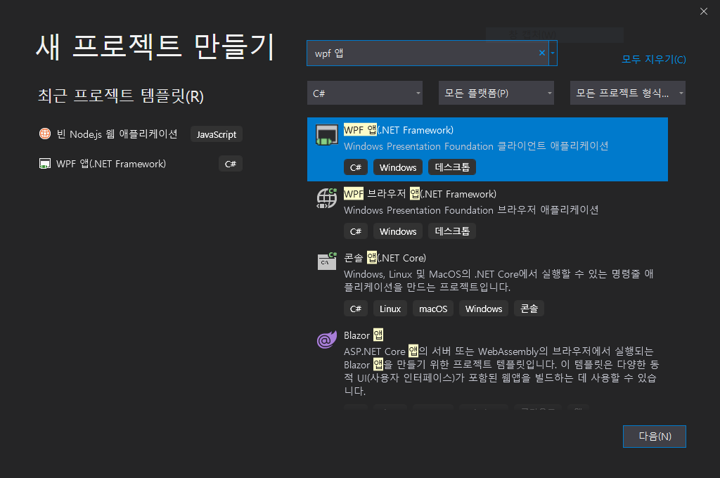 [새 프로젝트 만들기]에서 [WPF 앱(. NET Framework)]를 선택합니다.