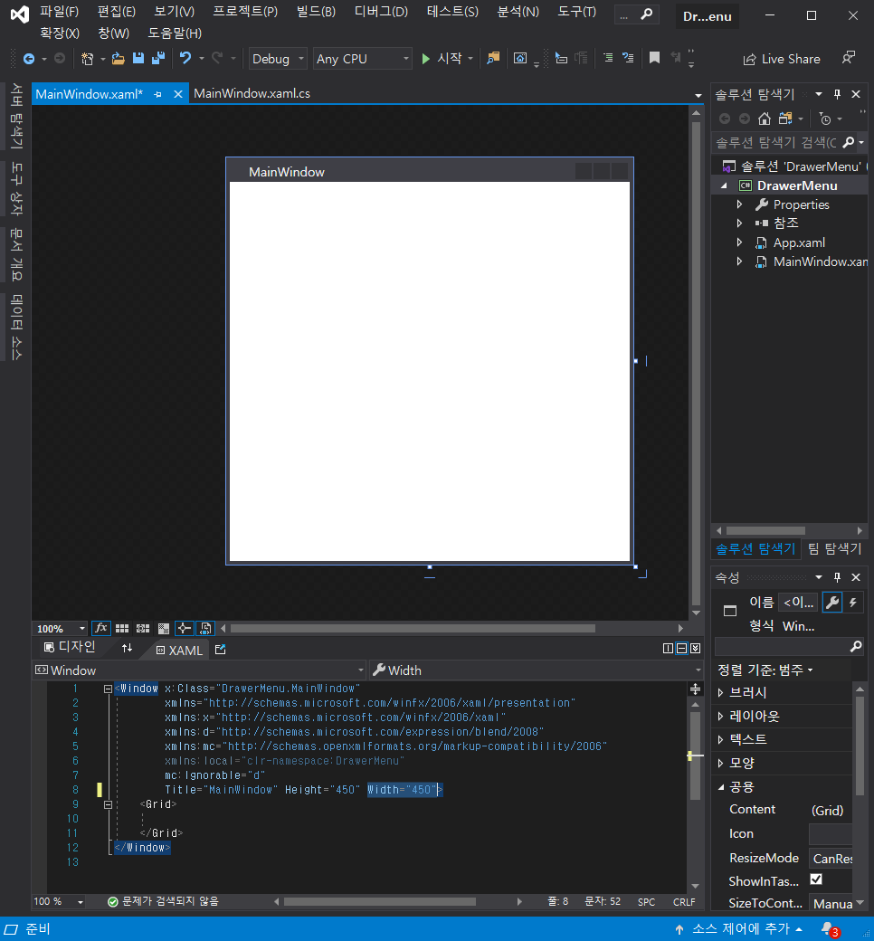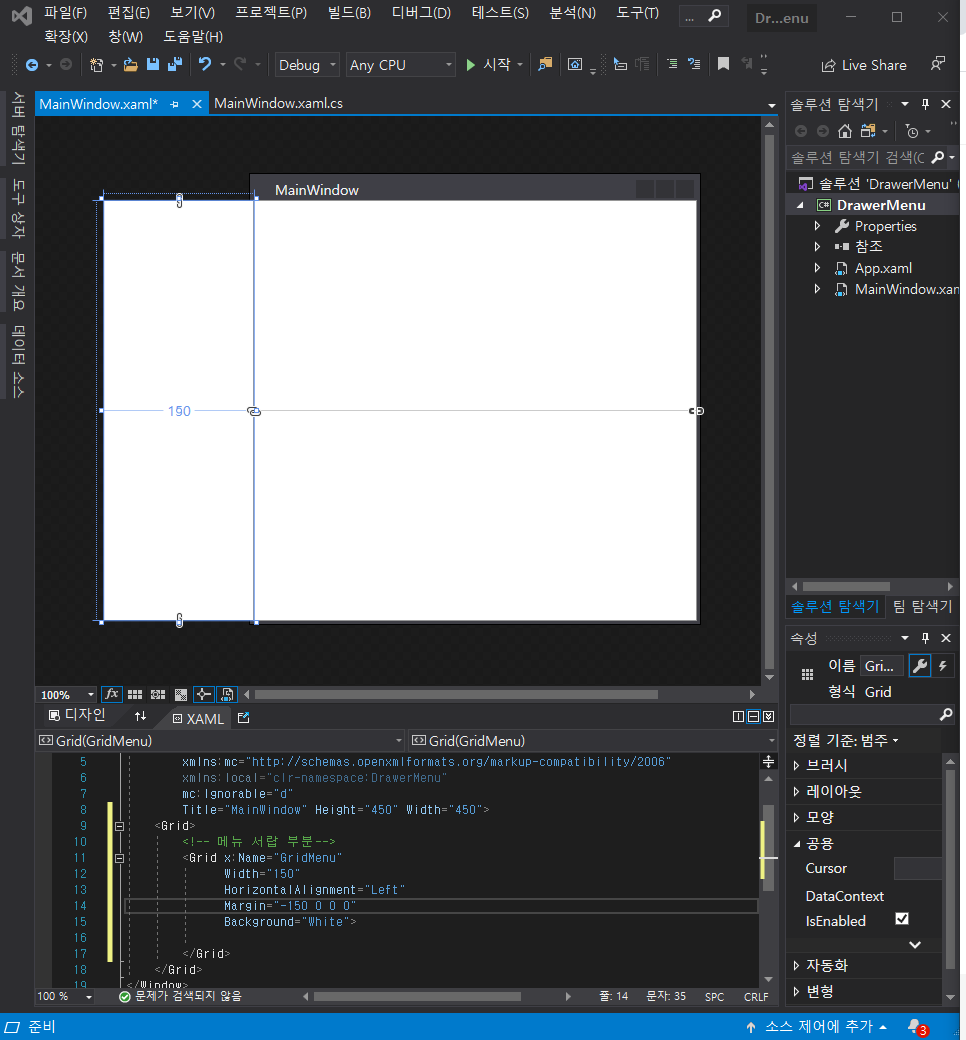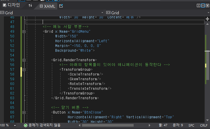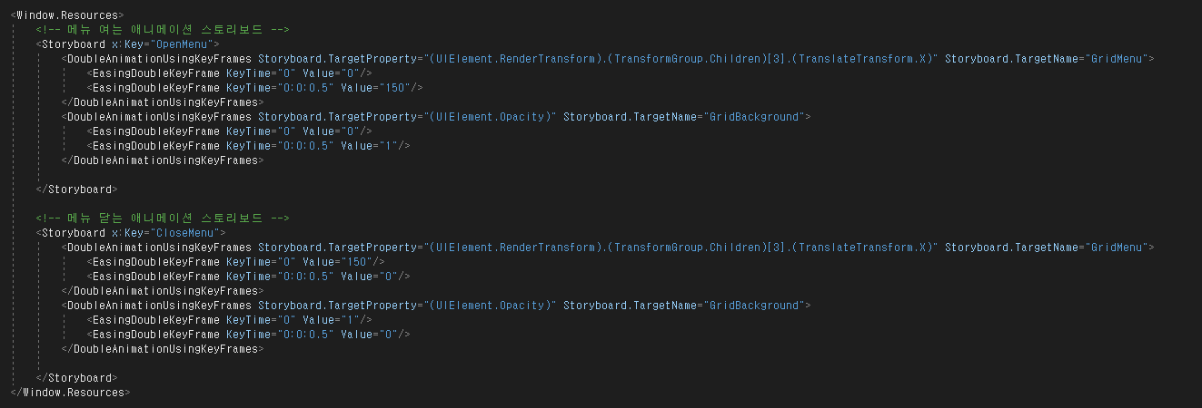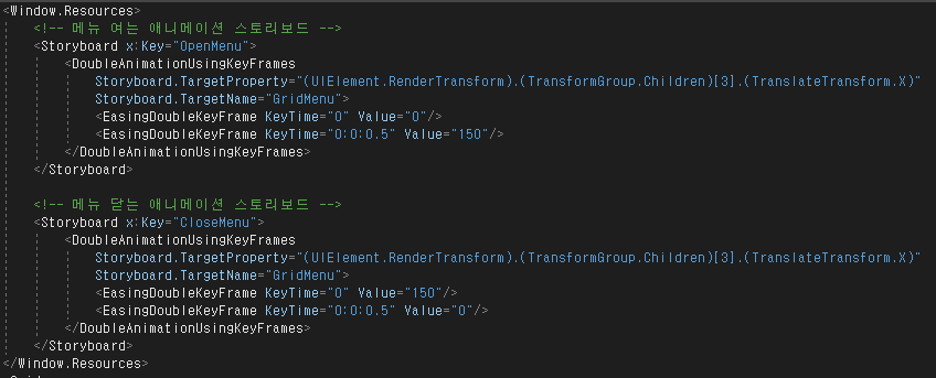 Storyboard의 Key값은 닫는 버튼의 Name 그리고 DoubleAnimationUsingKeyFrames의 Storyboard.TargetName을 꼭 서랍 메뉴 Grid Name으로 적어줘야 합니다.