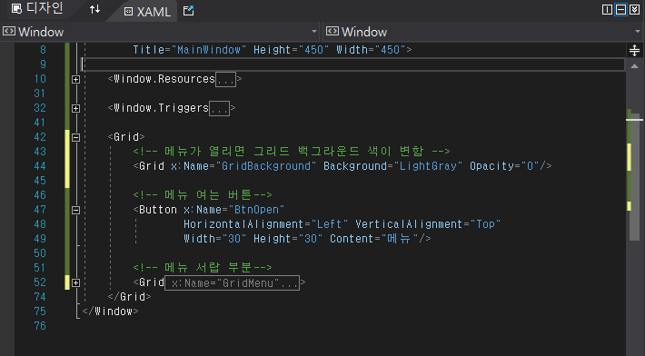 Storyboard의 Key값은 여는 버튼의 Name 그리고 DoubleAnimationUsingKeyFrames의 Storyboard.TargetName을 꼭 서랍 메뉴 Grid Name으로 적어줘야 합니다.