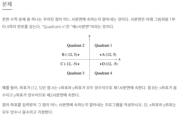 문제 흔한 수학 문제 중 하나는 주어진 점이 어느 사분면에 속하는지 알아내는 것이다. 사분면은 아래 그림처럼 1부터 4까지 번호를 갖는다. "Quadrant n"은 "제n사분면"이라는 뜻이다. 예를 들어, 좌표가 (12, 5)인 점 A는 x좌표와 y좌표가 모두 양수이므로 제1사분면에 속한다. 점 B는 x좌표가 음수이고 y좌표가 양수이므로 제2사분면에 속한다. 점의 좌표를 입력받아 그 점이 어느 사분면에 속하는지 알아내는 프로그램을 작성하시오. 단, x좌표