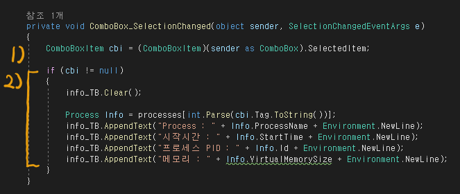 | SelectionChanged | ComboBox의 Item이 바뀔 때 새롭게 선택된 프로그램의 정보를 TextBox에 나타냅니다. | |