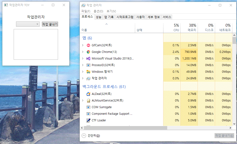 c# 코드로 [작업 관리자]에서 [작업 끝내기] 기능을 사용하면서 선택한 프로그램의 간단한 정보도 볼 수 있도록 만들어 보았습니다.