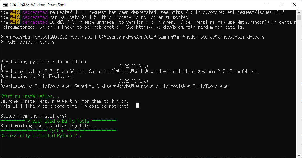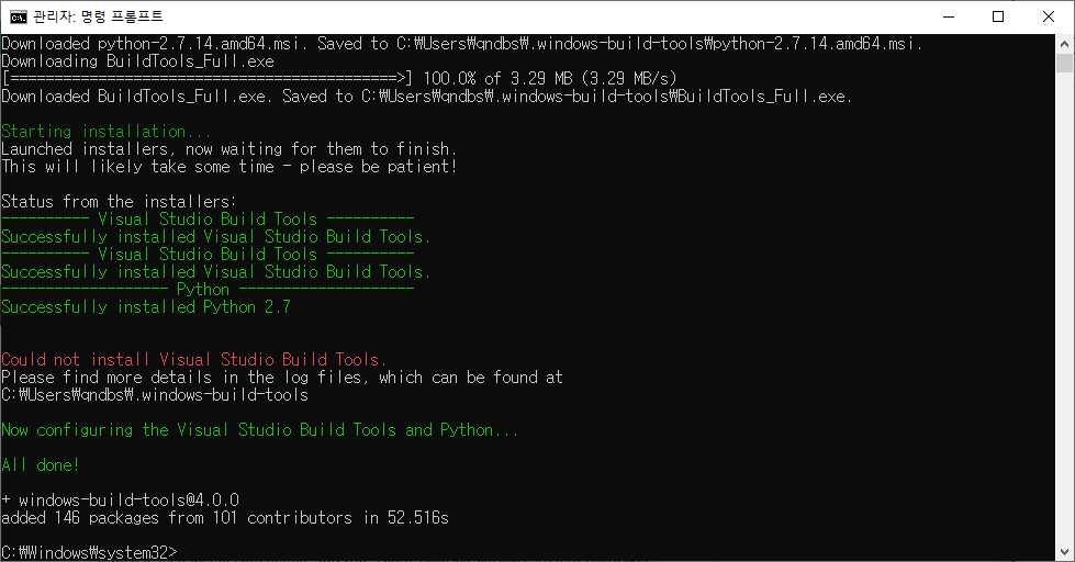 진행할 경우 Could not install Visual Studio Build Tools라는 오류가 발생하지만 다운로드가 완료됩니다.