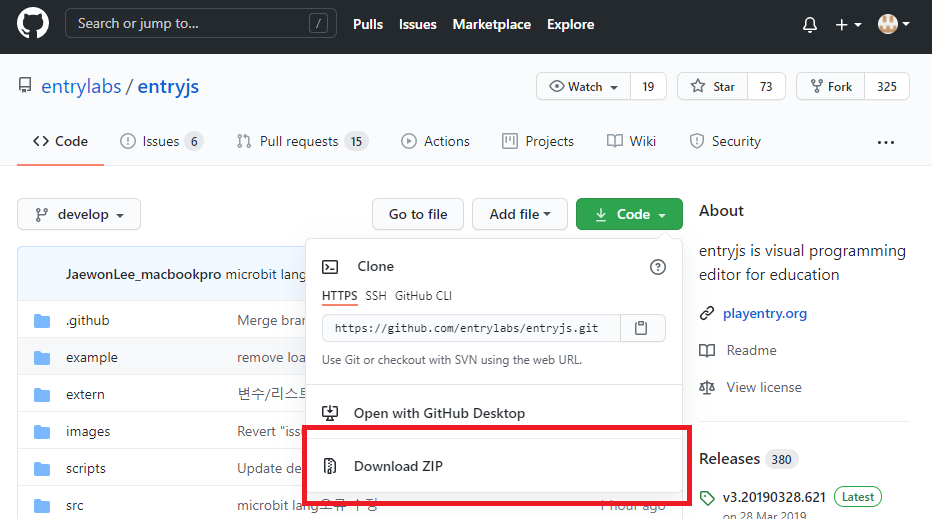 Entry GitHub에서 개발에 필요한 entryjs와 entry-hw를 다운로드합니다.