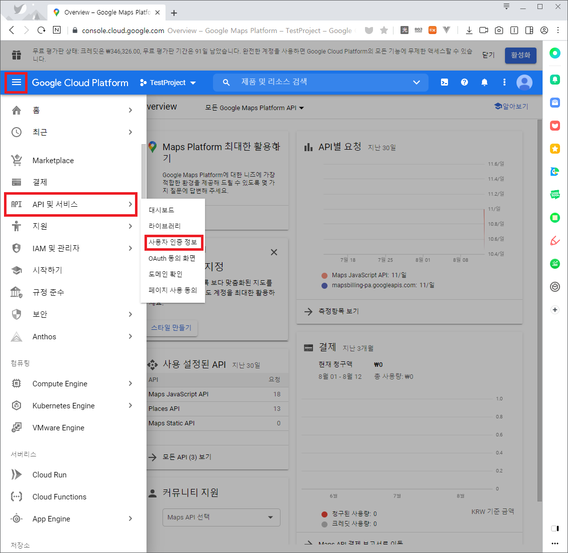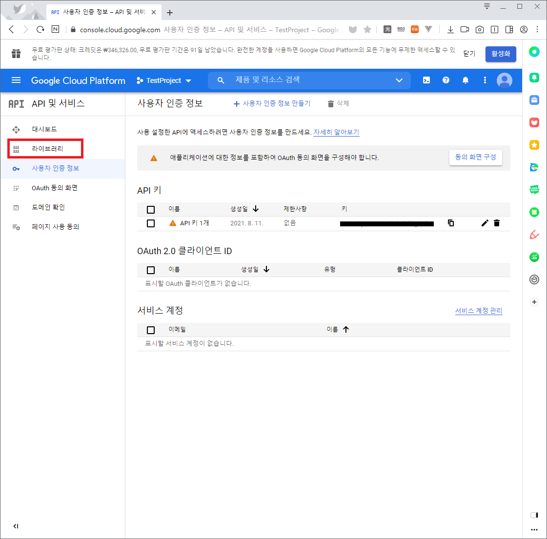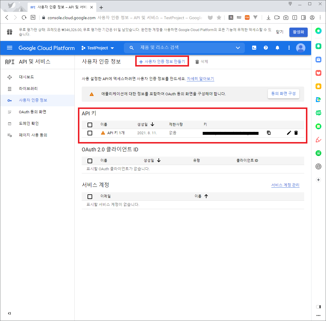 5) API 키가 존재하는지 확인합니다. API 키가 존재하지 않는다면 [사용자 인증 정보 만들기]로 API 키를 생성합니다.