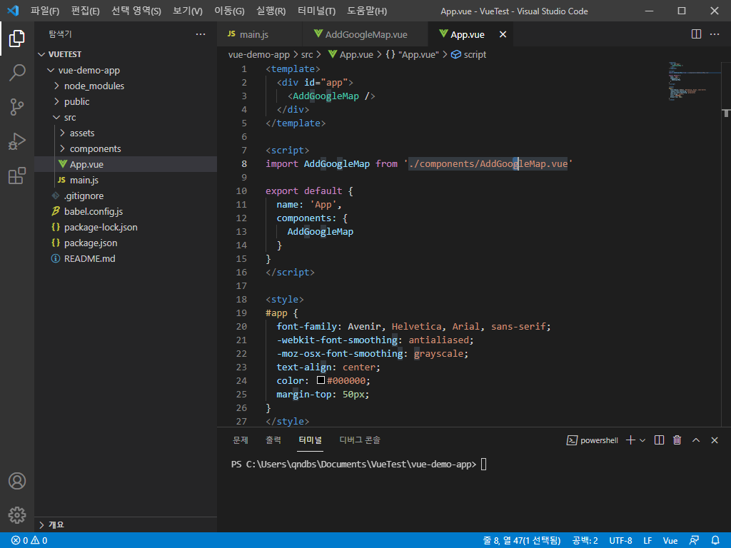 1) src/component/AddGoogleMap.vue 파일을 생성한 뒤 코드를 작성합니다.