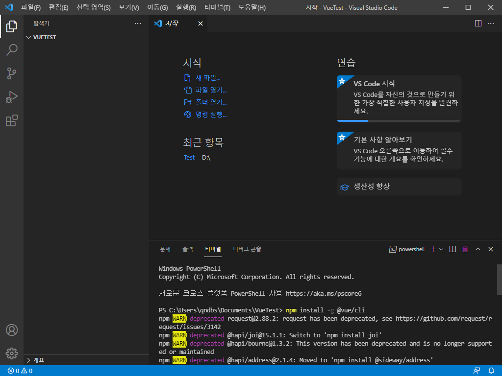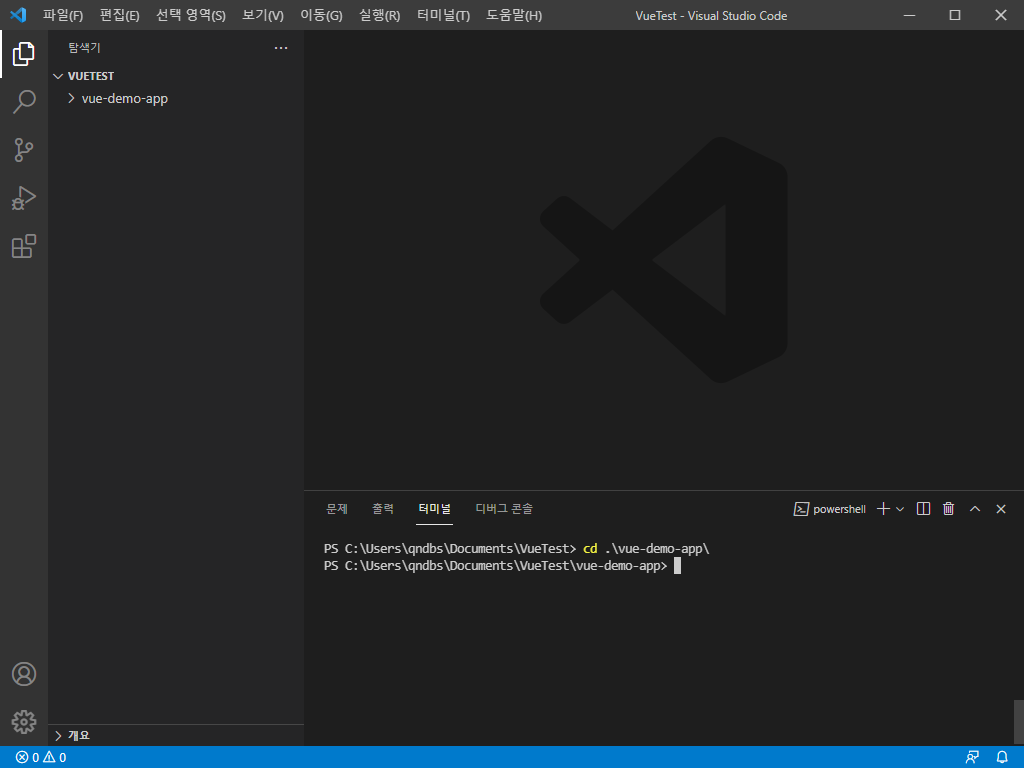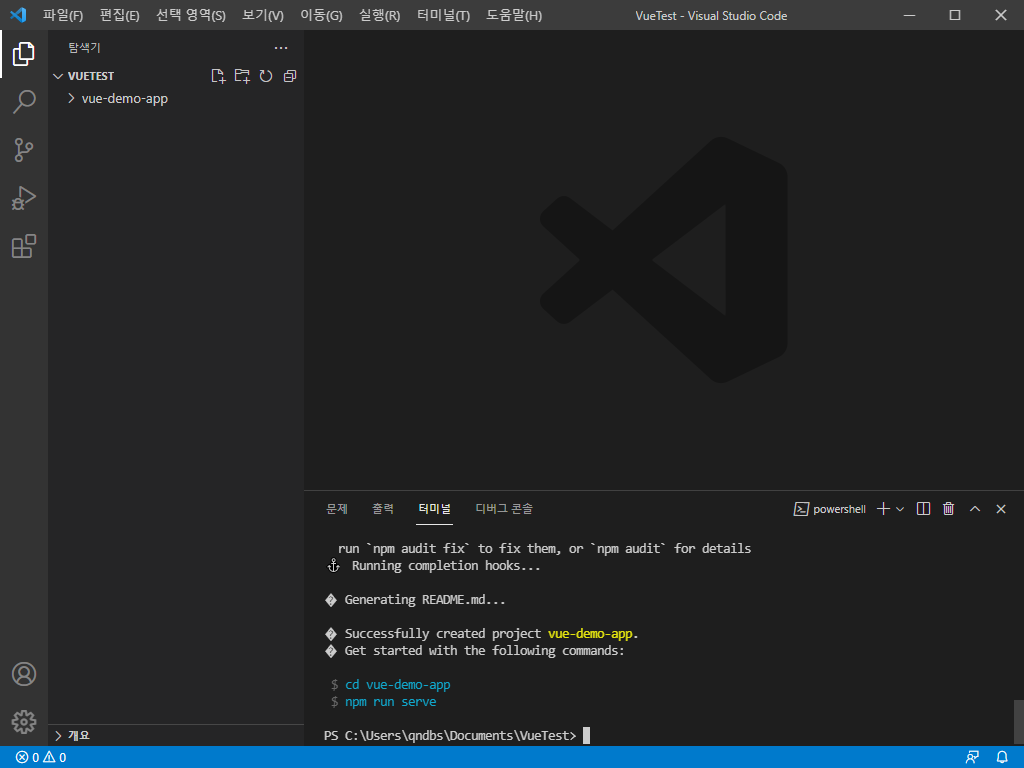 2) 터미널 창에서 vue 프로젝트를 생성합니다.