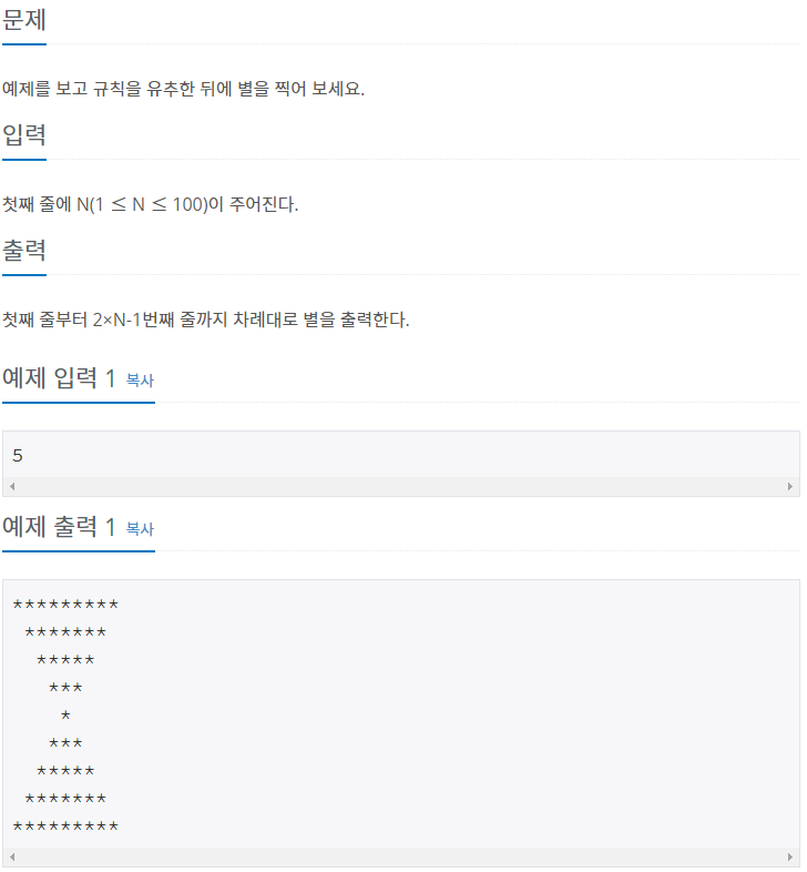 첫째 줄부터 2×N-1번째 줄까지 차례대로 별을 출력한다.