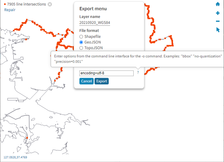 Export로 GeoJSON 포맷으로 변환합니다. 정밀도의 경우 필요에 따라서 설정하시면 됩니다. 그리고 한글 포맷을 위해서 UTF-8로 설정해주시는 것이 좋습니다. 이미지에서는 [encoding=utf-8]로 작성되어있지만 [encoding='UTF-8']로 해야됩니다.