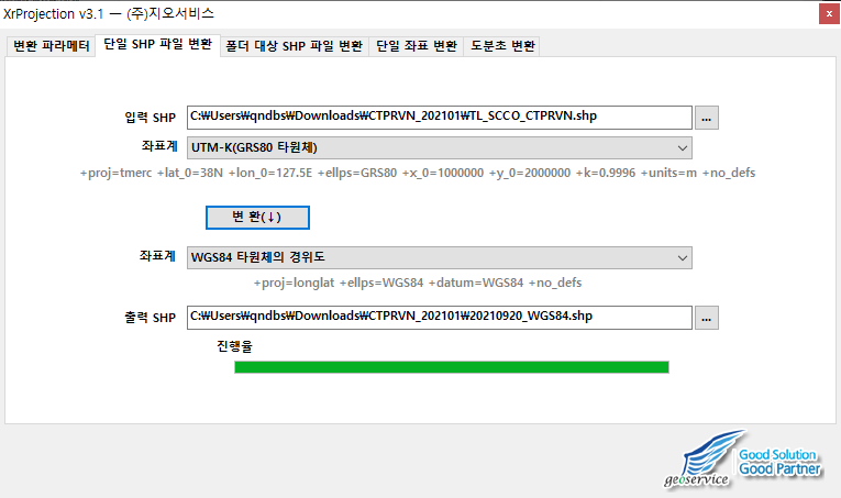 다운로드한 행정지도는 UTM-K로 되어 있기 때문에 WGS84 형태로 변환하려면 XrProjection 프로그램으로 좌표계를 변환시킵니다.