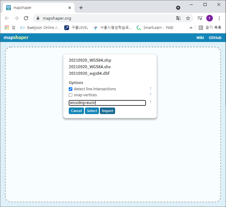 변환했던 파일들을 넣고 추가적으로 'encoding=euckr'(한글코드로 맞춤) 옵션을 준 뒤 Import 합니다.