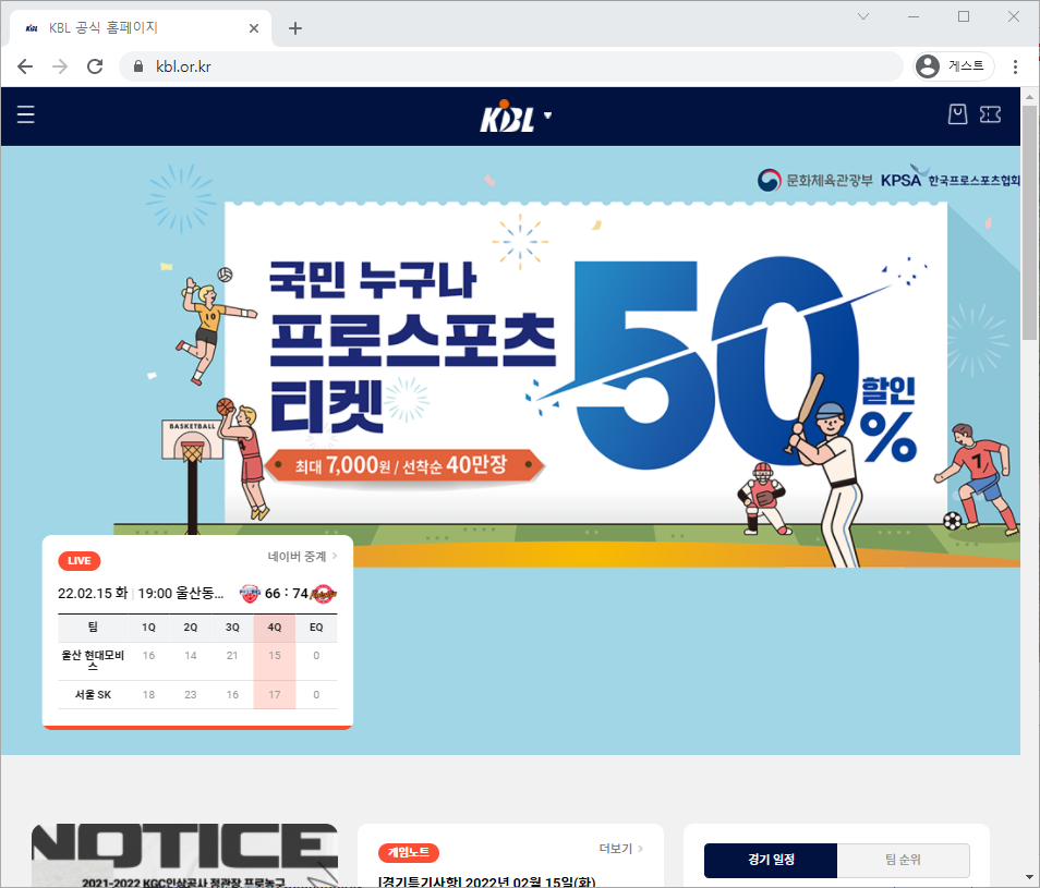 농구 경기를 관람하기 위해서는 우선 표를 구매해야 됩니다. 표의 경우 KBL 홈페이지나 어플을 통해서 구매를 할 수 있습니다. 온라인으로 표를 구매하기 위해서는 회원가입은 필수이므로 구매 전 회원가입 후 로그인을 먼저 하시는 것을 추천드립니다.