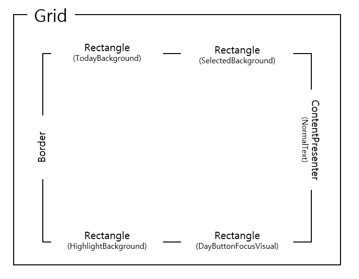 VisualState는 Control의 시각적 상태를 나타냅니다. CalendarButtonStyle은 이벤트에서 시각적 변화를 주기 위해서 VisualStateGroup의 x:Name을 각각 CommonStates(MouseOver, Pressed), SelectionStates(Selected), ActiveStates(InActive), CalendarButtonFocusStates(CalendarButtonFocused)로 설정했습니다.