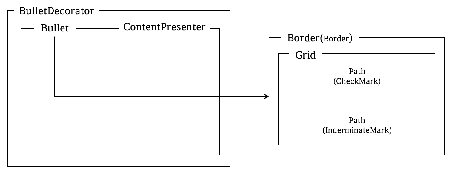 예제의 CheckBox 구성을 이미지로 나타내어보면 위와 같이 BulletDecorator가 BulletDecorator.Bullet와 ContentPresenter를 감싼 모습입니다.