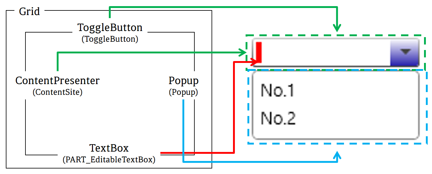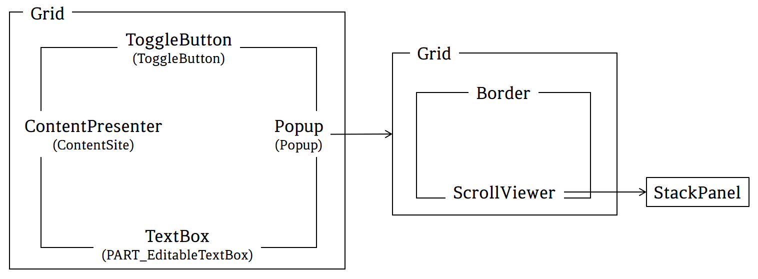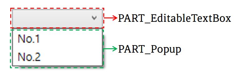 Microsoft에서 안내하는 기본 ComboBox의 구성은 PART_EditableTextBox와 PART_Popup으로 나눠집니다. PART_EditableTextBox의 유형은 TextBox로 ComboBox의 텍스트를 포함합니다. PART_Popup의 유형은 Popup으로 ComboBox에 있는 항목을 DropDown합니다.