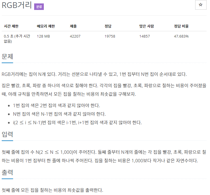 RGB[i][빨간색] = 최솟값(RGB[i-1][초록색], RGB[i-1][파란색]) + RGB[i][빨간색]