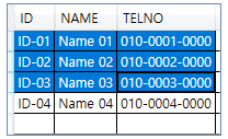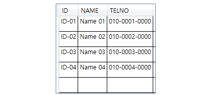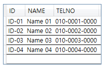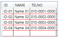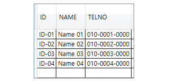 예제의 XAML 코드를 DataGrid에 적용하면 위와 같은 결과가 나옵니다. 이러한 결과에 도달하도록 코드 순서로 속성을 살펴보면 다음과 같습니다.
