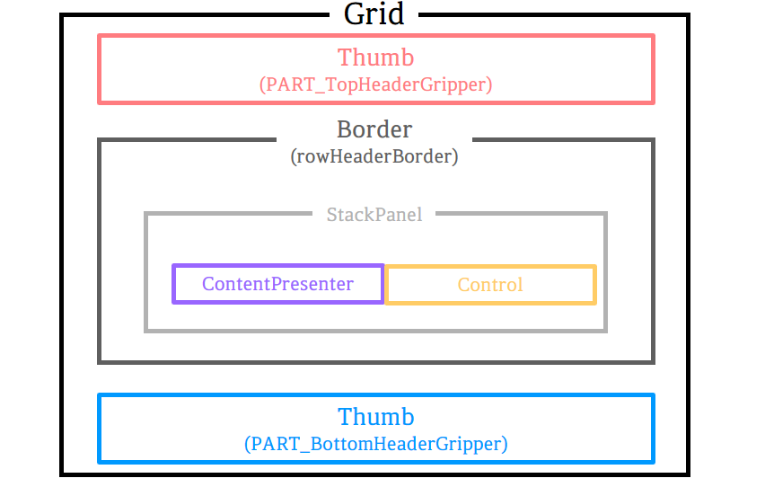 예제의 Template에서 구성한 DataGridRowHeader는 위의 이미지와 같이 Grid가 Border와 Thumb를 감싸는 형태로 구성되어있습니다.