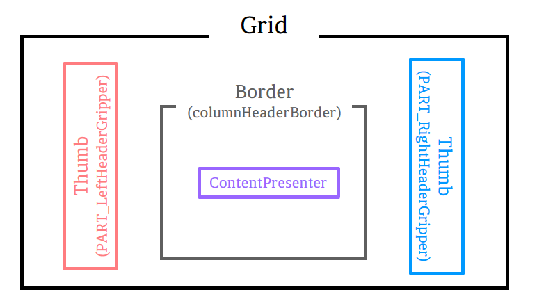 예제의 Template에서 구성한 DataGridColumnHeader는 위의 이미지와 같이 Grid가 Border와 Thumb를 감싸는 형태로 구성되어있습니다.