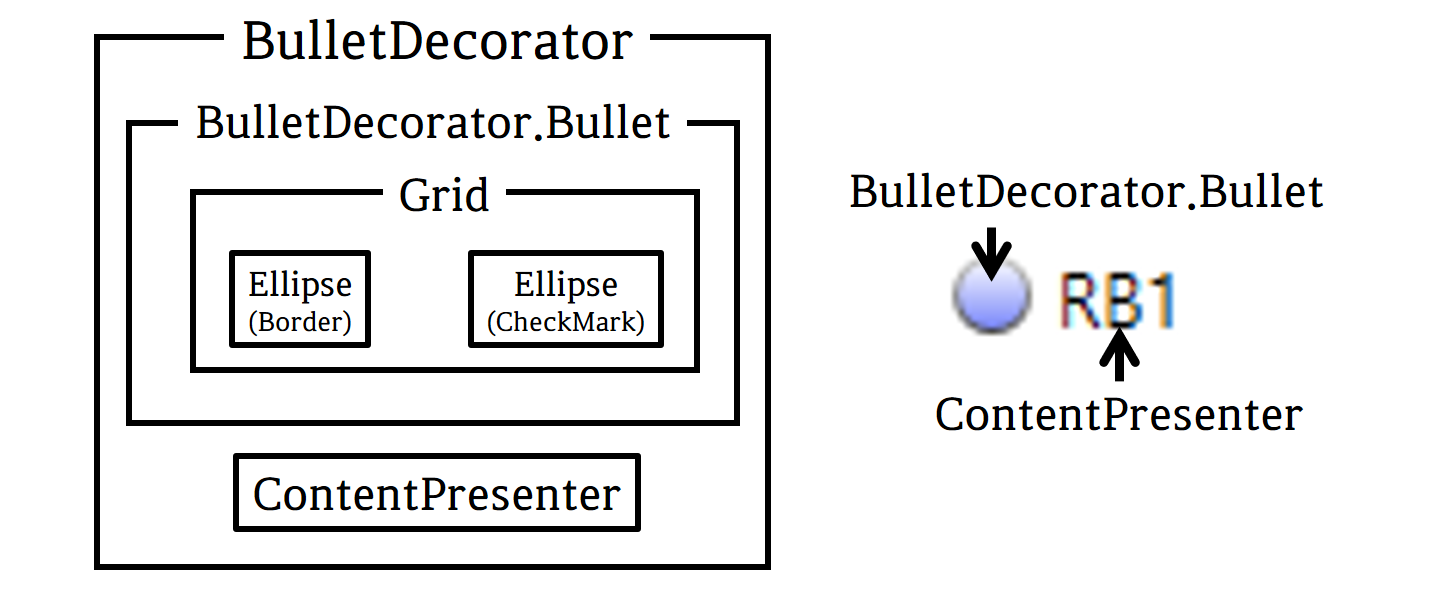 RadioButton은 BulletDecorator를 사용하여 Bullet 부분과 ContentPresenter로 나누어서 구성되어 있습니다. Bullet의 경우 Grid 내부에 2개의 Ellipse를 구성하여 이벤트를 통해서 RadioButton의 true/false를 표현했습니다.