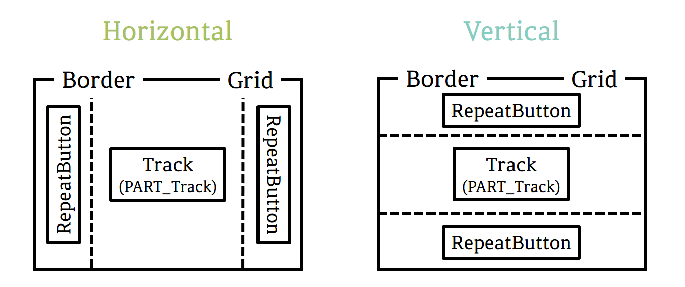 예제에서 사용된 HorizontalScrollBar와 VerticalScrollBar는 ScrollBar의 Orientation의 값에 따라서 ScrollBar Template에 사용할 ControlTemplate을 미리 정의해둔 것입니다.