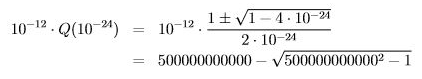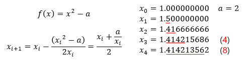 : 이차적 수렴은 자릿수의 개수가 두 배로 늘어나는 것을 의미합니다. 따라서 뉴튼 방법을 사용하기 위해서는 고정밀 나눗셈을 계산해야 합니다.