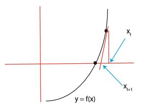 점(xi, f(xi))에서의 접선은 y = f(xi) + f'(xi)·(x-xi)이고 f'(xi)는 도함수입니다. xi+1은 x축과의 교점이 됩니다.