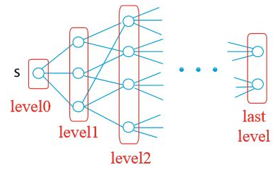 - 모든 나가는 간선을 사용해 level i-1에서 level i > 0를 만듭니다. 하지만 이전 level의 정점은 무시합니다.