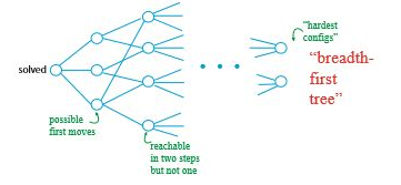 8! 은 임의의 위치에서의 8개의 큐브릿을 의미하고 3^(8)은 각각의 큐브릿을 세 번 돌릴 수 있다는 것을 의미합니다. - 한 상태에서 다른 상태로의 기본 이동에 대한 간선(예: 90도 회전)