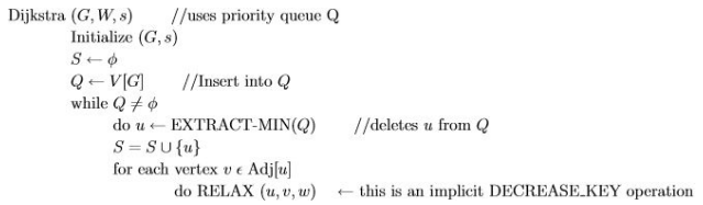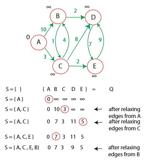 각 간선 (u, v) ∈ E에 대하여, w(u, v) ≥ 0을 가정하고, 정점의 집합 S에 최단 경로의 값이 결정된 정점만을 유지합니다. 최소인 최단 경로 어림을 가지는 u 를 V − S 집합에서 반복적으로 선택하여, u 를 S 에 넣고, u 로부터 나가는 모든 간선에 대해 완화합니다.