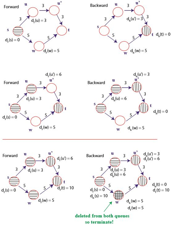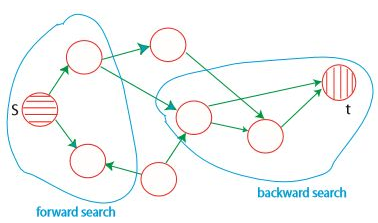 s에서 시작하는 기존의 다익스트라 알고리즘의 첫 번째 단계를 실행해서 순방향으로 경로를 찾습니다. 그리고 t에서부터의 역방향 탐색(간선을 반대로 따라가는 것)을 시작합니다.