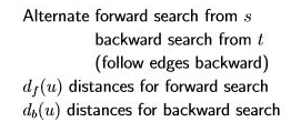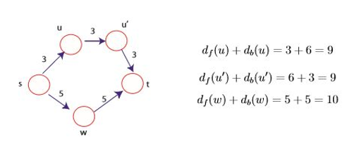 어떤 정점 u가 전방향 탐색과 역방향 탐색 모두에서 처리된 경우입니다. 이 조건은 경계가 만난다는 것을 의미합니다. 즉 전진 탐색과 후진 탐색 모두의 우선순위 큐 Qf와 Qb에서 제거되었을 때 종료합니다.