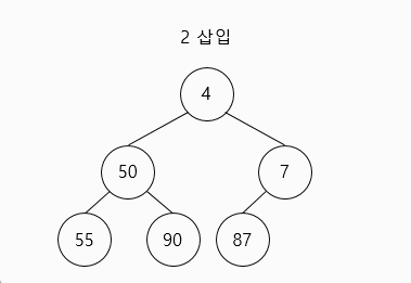 새로운 원소는 밑바닥 가장 오른쪽 위치로 삽입됩니다. 그다음에 새로 삽입된 원소가 제대로 된 자리를 찾을 때까지 부모 노드와 교환해 나갑니다.