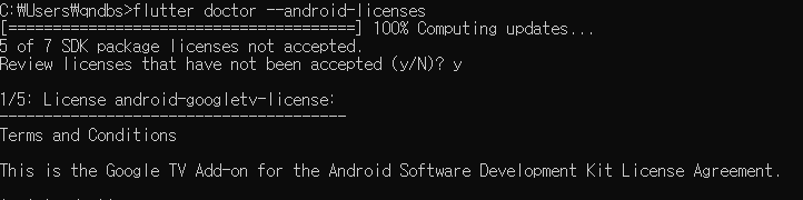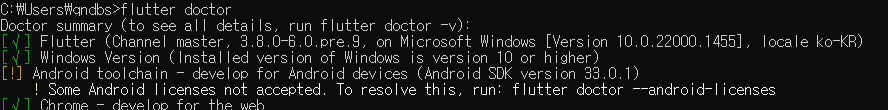 5. flutter doctor로 확인했을 때 license관련 오류가 발생하면 flutter doctor --android-licenses 명령어로 해결합니다.