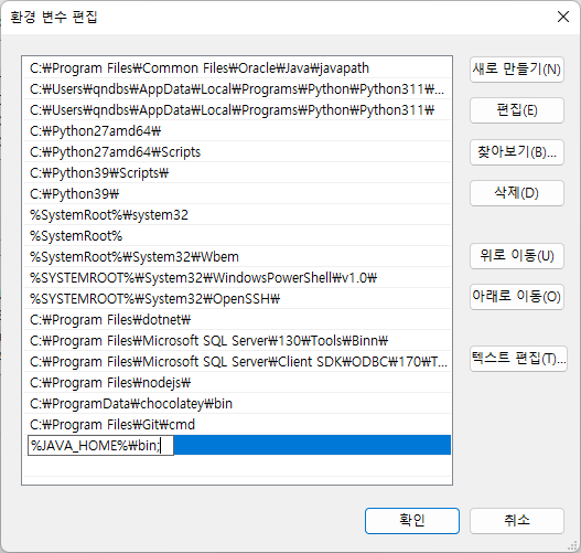 3-2) [시스템 변수] Path에 %JAVA_HOME%\bin을 추가합니다.