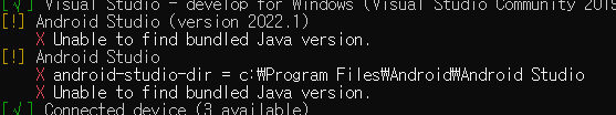 flutter 설치 후 flutter doctor에서 위와 같이 Android Studio 오류가 발생했을 때