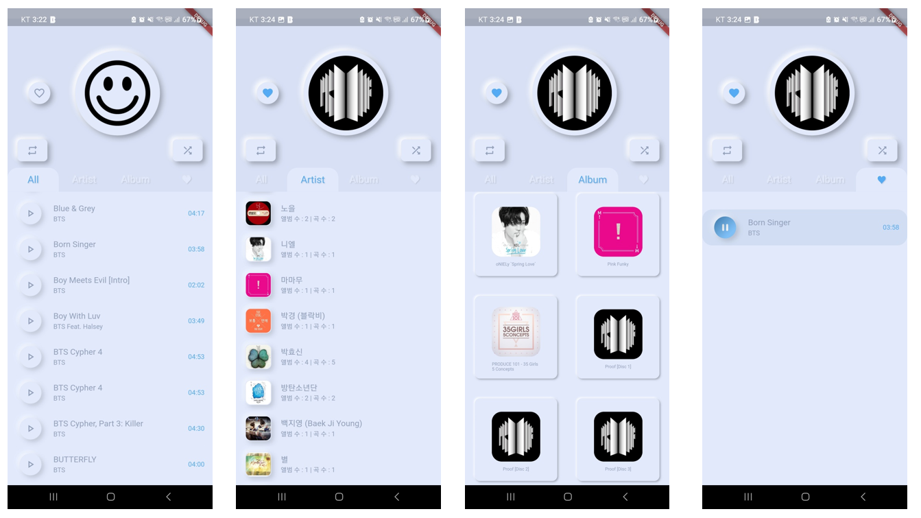 기본적인 음악앱보다 좀 더 간단하게 만들어 보았습니다. 메인 페이지는 Tab 형식으로 모든 음악, 가수, 앨범, 좋아하는 노래로 나누어서 구성을 했습니다. 모든 음악에서는 핸드폰에 존재하는 모든 음원 파일 중 mp3 파일을 불러오도록 설정했습니다.