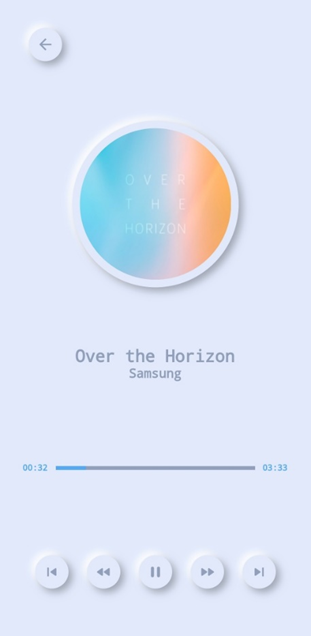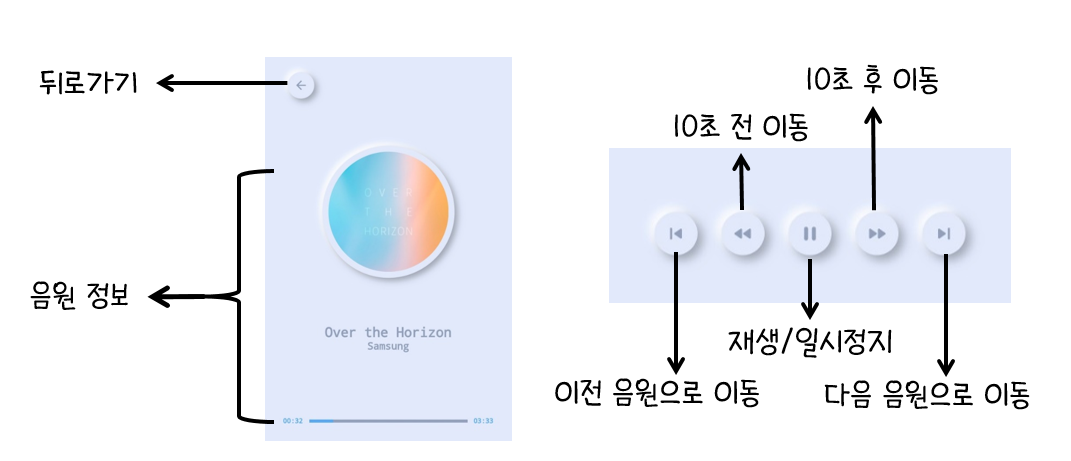 음원 페이지에는 음원 정보(앨범아트, 제목, 가수명, 시간)와 간단한 조작으로 구성했습니다.