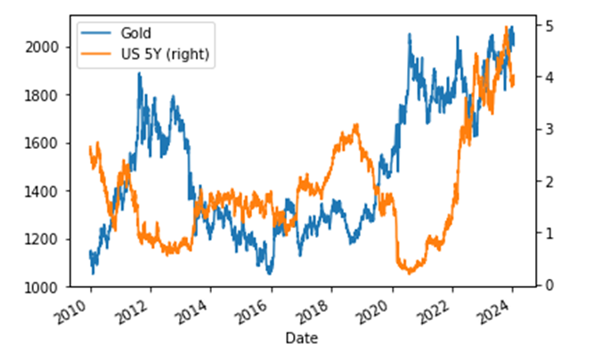 # 금 선물과 5년 국채