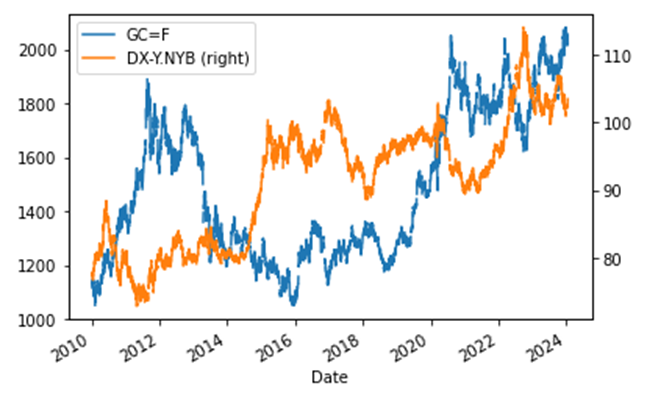 df = fdr.DataReader('GC=F,DX-Y.NYB', '2010')