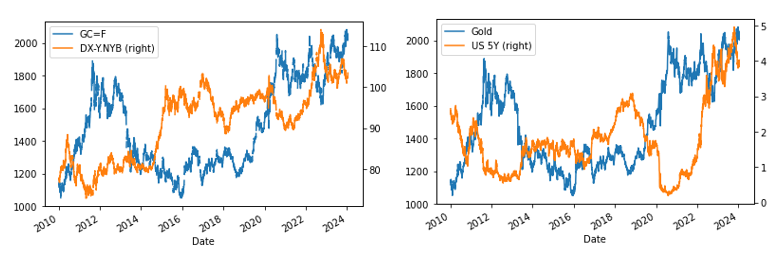 # 2010년부터 현재까지의 금 선물(GC=F)과 달러 인덱스(DX-Y.NYB)