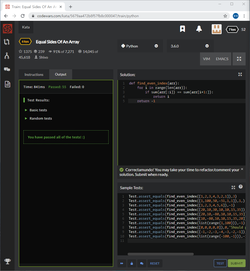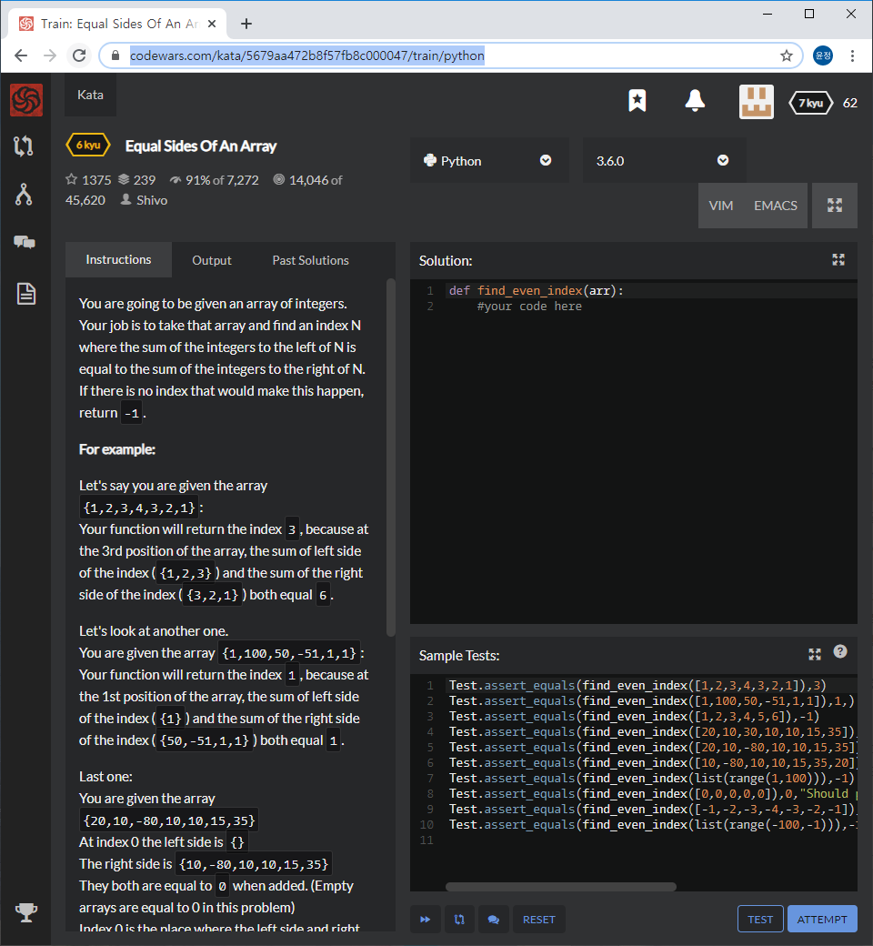 주어진 배열에서 한 개의 인덱스를 기준으로 왼쪽과 오른쪽의 합이 같은 인덱스를 찾는 문제이다.