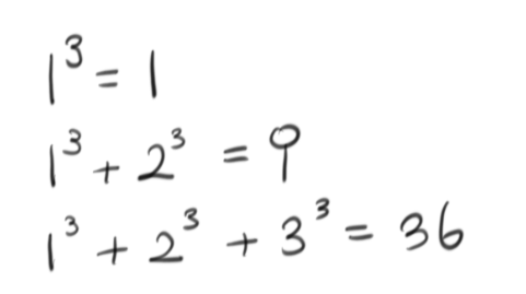 이것에 맞춰서 코드를 제작해 보았지만 문제가 잘 풀리지 않았습니다. 문제를 다시 살펴보니 sum of the cubes라는 말도 파파고가 제곱합이라고 번역을 했었습니다. 정확한 뜻으로 sum of cubes는 세제곱의 합을 의미합니다. 예를 들어서 [1, 2, 3]의 sum of cubes는 아래의 그림과 같습니다.