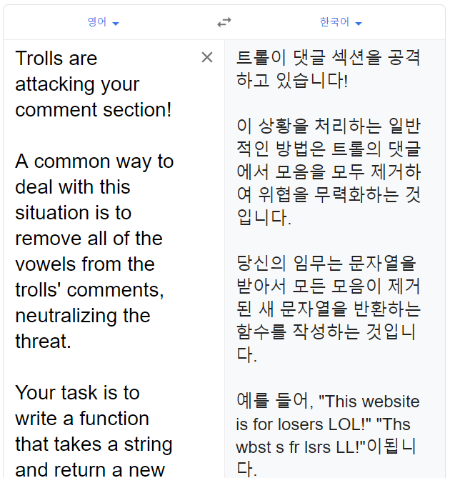 이 문제는 간단히 말하자면 입력받은 문자열의 모음(AEIOU)을 지우고 리턴하는 것입니다.