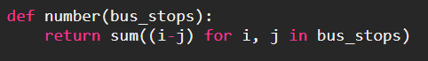 버스에 탑승한 인원을 나타내는 변수(answer)를 생성 후 버스 정류장 배열의 첫 번째 원소(i[0])에서 버스 정류장 배열의 두 번째 원소(i[1])를 뺀 후 버스에 탑승한 인원에 더해 줬습니다.