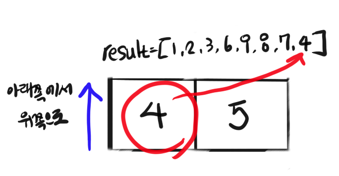 위와 같은 예의 경우 입력값이 [[1, 2, 3], [4, 5, 6], [7, 8, 9]]인 경우 [1, 2, 3, 6, 9, 8, 7, 4, 5]를 구하는 것입니다.